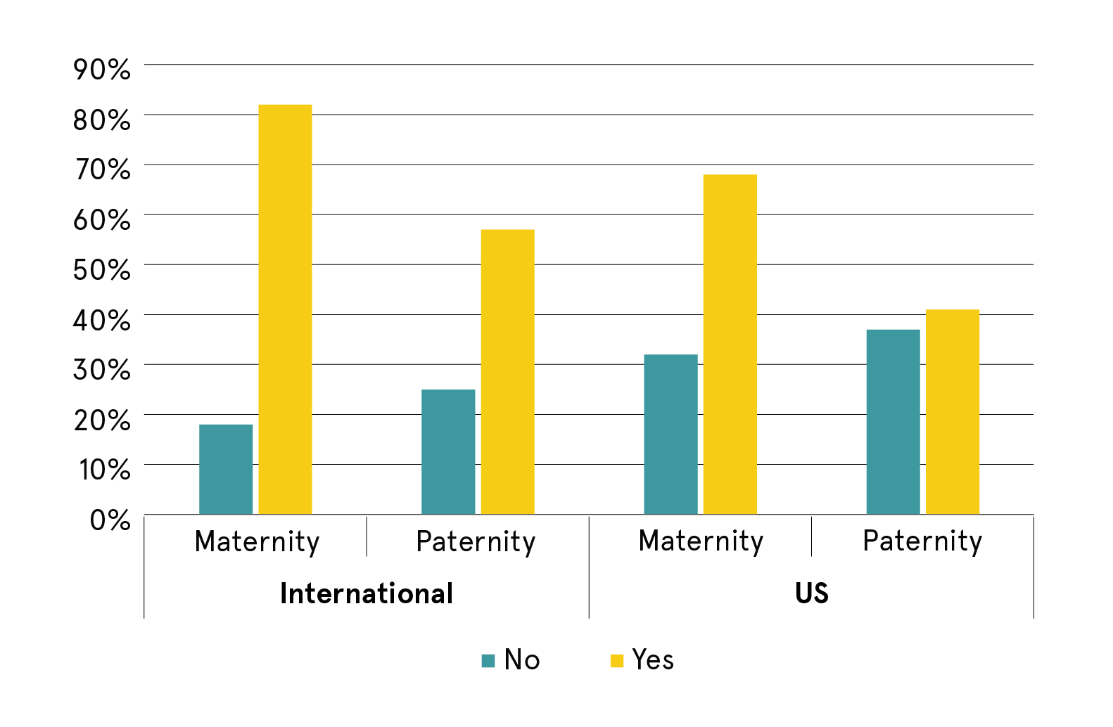 Parental leave is another contributor to the gap in inclusion and advancement of women. Maternity leave is a benefit provided to the majority of full-time workers1 (both in the U.S. and around the world), but it is far from a universal guarantee (Figure 3). Paternity leave is less common, with only about half of respondents worldwide reporting this benefit. Over half of non-U.S. respondents have it (57%), while less than half of U.S. respondents do (41%).