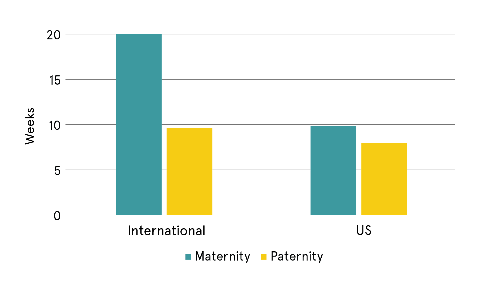 Quantity of leave extends the story beyond the binary of have/have not. Standards are high among non-U.S. respondents whose companies offer maternity leave, with an average of 20 weeks (Figure 4). The U.S. maternity leave average is much lower at roughly 10 weeks. Among the smaller portion that has paternity leave, average durations were lower. Outside the U.S., the duration fell by half compared to maternity leave (from 20 weeks to 10). The comparative drop was less in the U.S., but the 8-week paternity leave average for the U.S. was still less than the 10-week average in the rest of the world.
