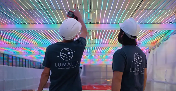 Fiel a su compromiso con la innovación, el equipo de Lumalia Studio diseñó y fabricó a medida todos los elementos utilizados en la instalación. Parafraseando la descripción publicada en su web, “la superficie es un híbrido entre iluminación y pantalla de baja resolución que cobra vida a través de los contenidos diseñados para esta solución. A través de movimientos abstractos de masas de luz y color, de cielos animados y juegos de sombras se alcanza una experiencia inmersiva, creando diferentes atmósferas que mezclan espectacularidad, sutileza y elegancia. Es una narrativa visual que destaca la interacción entre tecnología, creatividad y el entorno arquitectónico. La fusión entre lo técnico y lo artístico crea una experiencia única, redefiniendo la forma en que la luz puede transformar y dar vida a un espacio”.