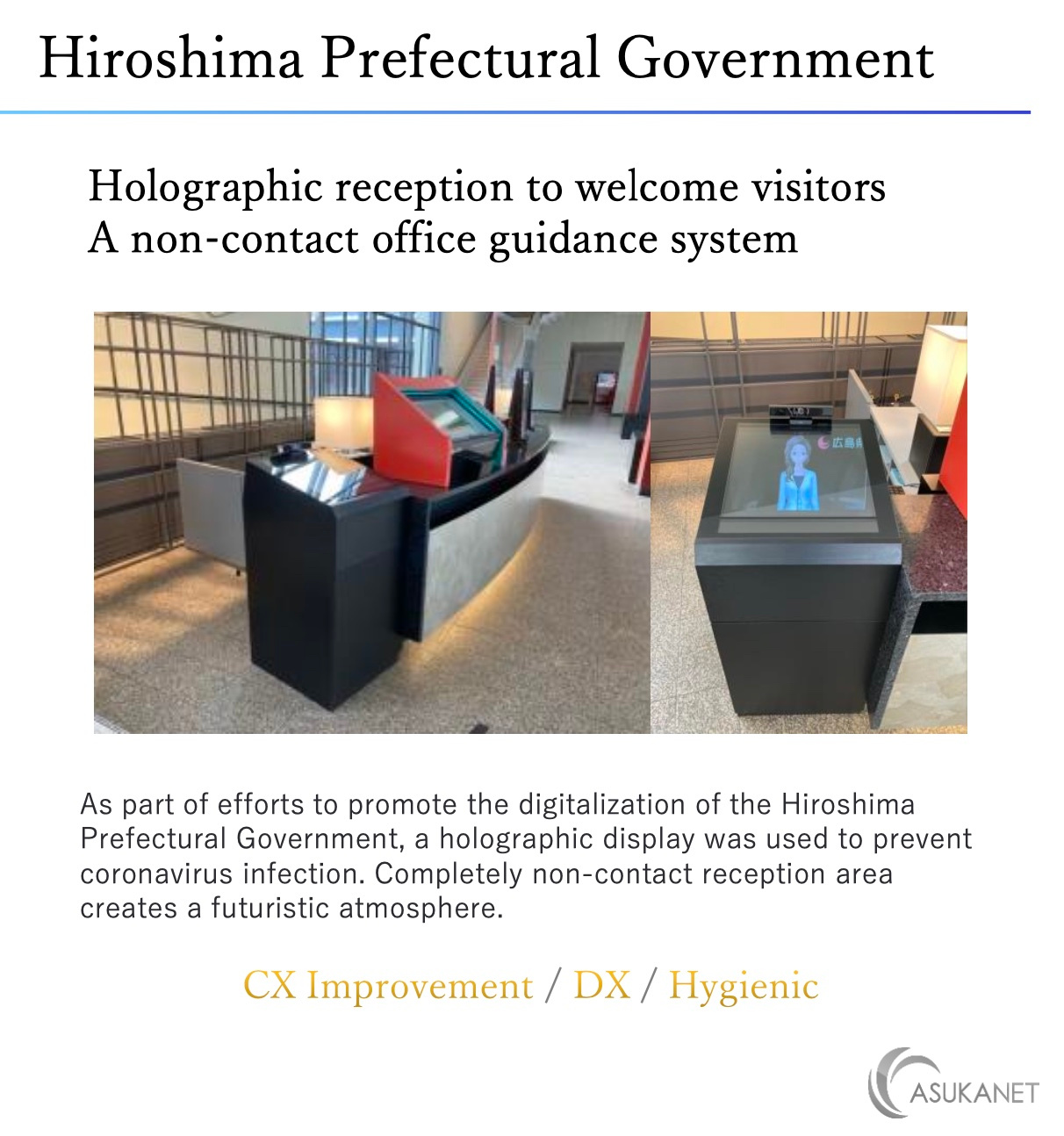 Another example that we would like to show is the case for Hiroshima Prefectural Government. They adopted the ASKA3D holographic technology in their reception machine as well. As you can see in the photo above, by selecting some menu, the visitors will get to see some avatar or animation. And this avatar is actually connected by tele-communication system to the workers inside the building. They can talk to the visitors. Because the avatar is displayed in the mid-air by ASKA3D holograph technology, the visitors have new experience as if they are actually talking to the real person real time.