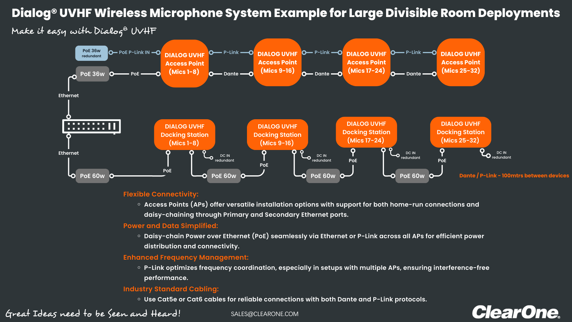 - A dedicated proprietary link between access points allows them to daisy-chain and communicate seamlessly. This is in addition to the Dante audio integration included.