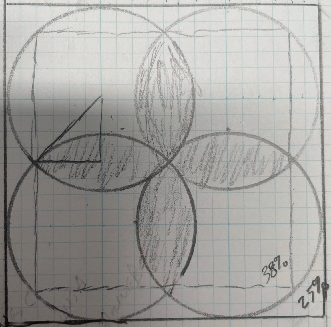 (Update: I ended up solving the overlapping area by percentage for several different permutations of overlapping circles and bounding squares. I didn't come up with anything that would match the "50%" and "20%" patterns. See Below. My calculated percentages are in the lower right of each bounding box.)