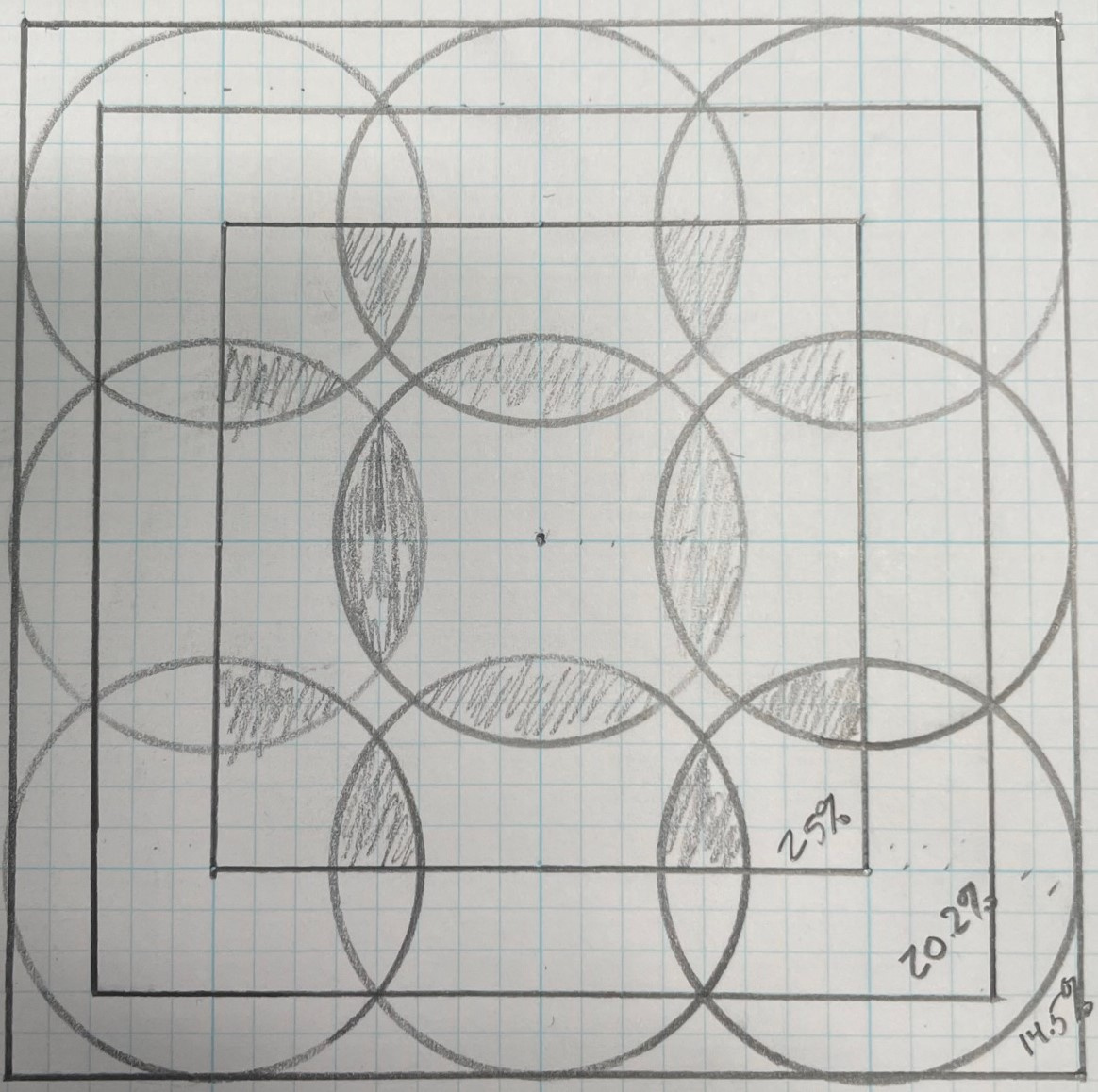 (Update: In the above image, 25.56% of the square is covered by overlaps in speaker coverage. Looks like this is not the solution to my query, as the pattern is 'looser' than the "20%" overlap pattern.)