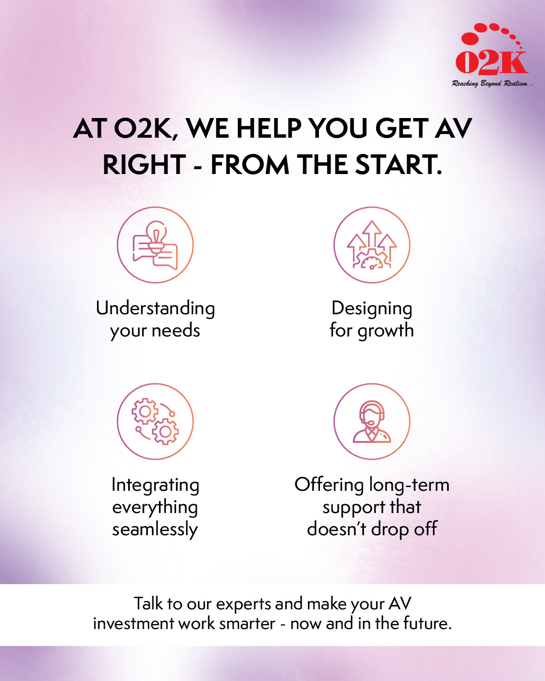 At O2K, we focus on the big picture. We don’t just deliver AV systems — we deliver systems that work, evolve with your space, and feel effortless for your team to use.