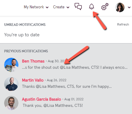 - If the @mention is in a private conversation, the notification will come through the conversations icon at the top of the community.