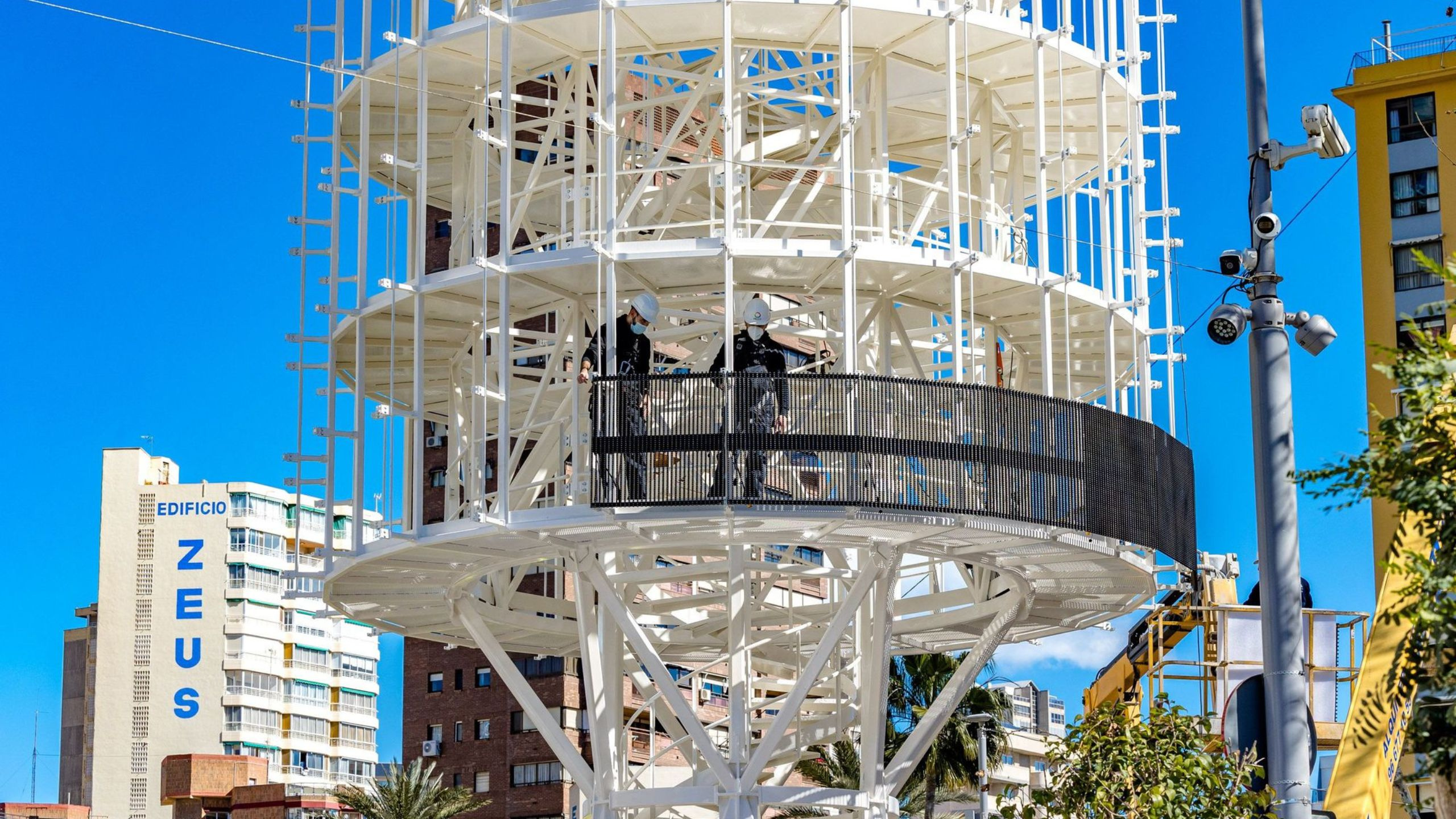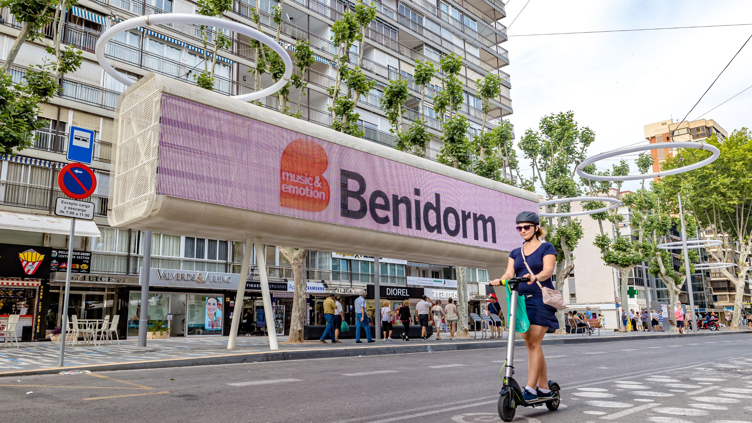 The LED screen broadcasts content from 8:00 a.m. to 12:00 a.m. and the techno-stop from 6:00 a.m. to 1:00 a.m., with specific night-time content to avoid dazzling or disturbing the neighbors. In summer, these spaces generate about one and a half million hits a week. In addition, the Tecnohito will act as a viewpoint, since it will be possible to visit and enjoy a panoramic view of the city from the Plaza de la Hispanidad, thus becoming a new tourist spot in Benidorm.