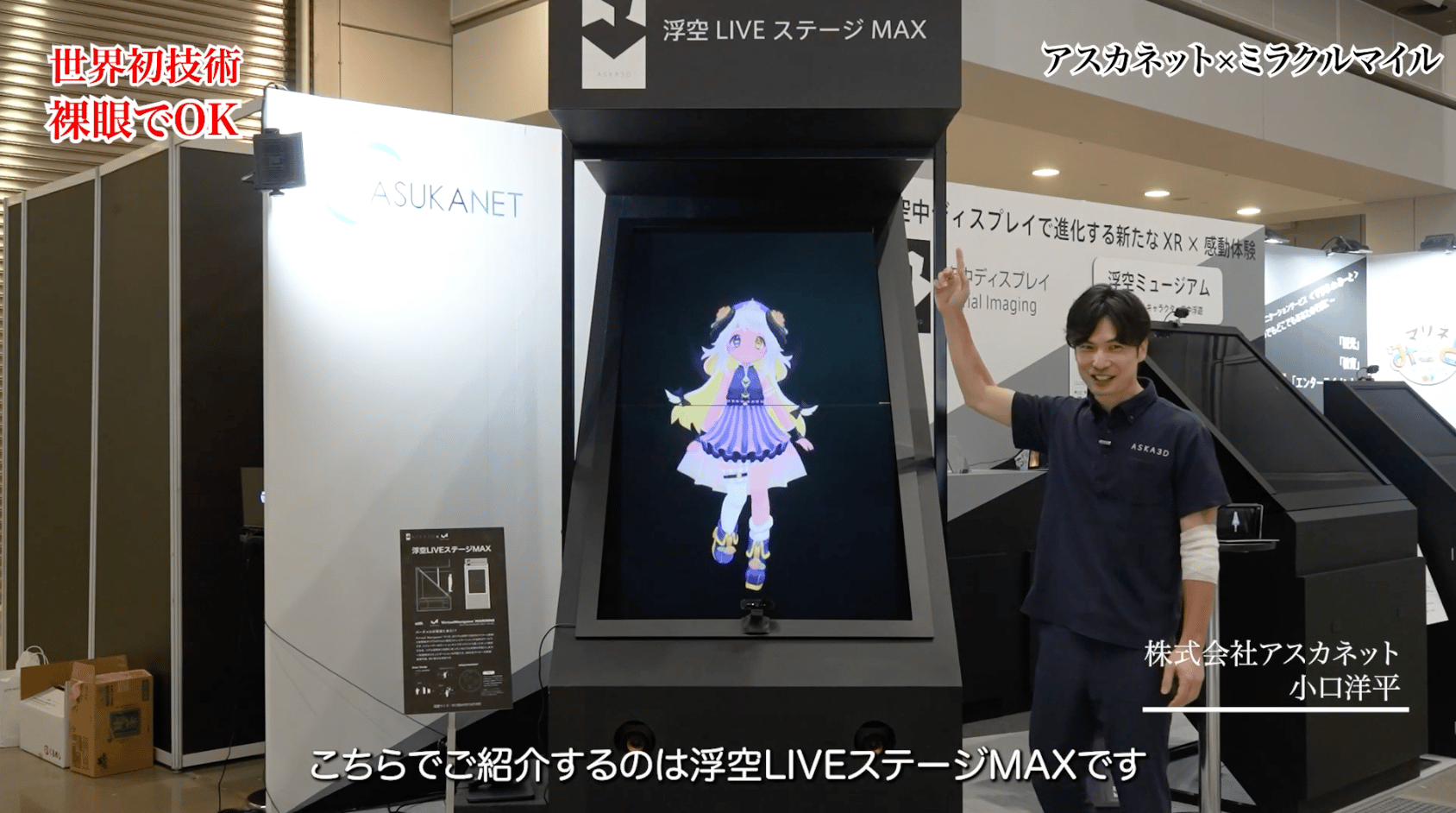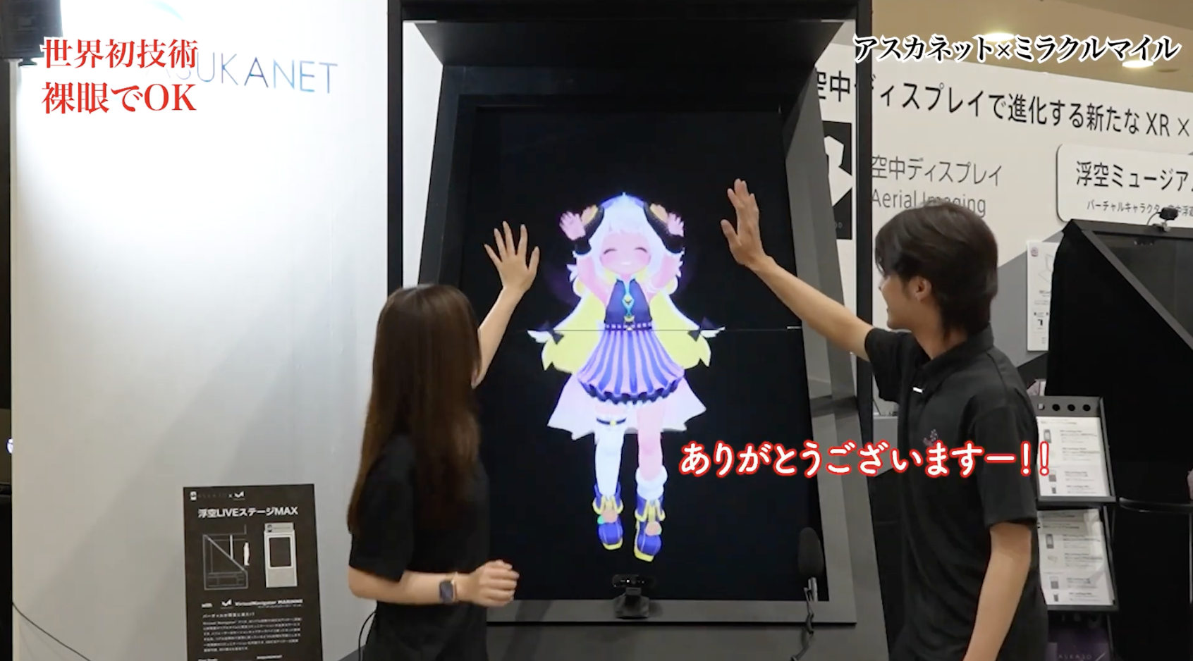 This large-scale immersive stage utilizes holographic display technology to show the “Live” Virtual YouTuber (VTuber) character in the mid-air. The visitors were astonished that they were able to talk to the character and make interaction such as hand-shaking and doing high five. The result is a powerful, visually stunning experience. It provides the complete “Out of the Box” experience that characters who live inside the screen show up in the real world in the mid-air by using the cutting edge ASKA3D holographic display technology.