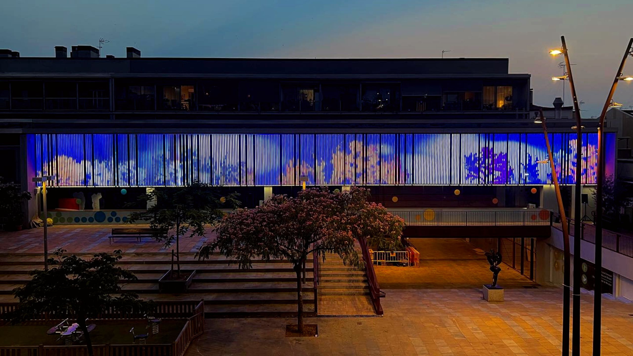 This multimedia facade consists of vertical slats with RGB LED pixels, allowing natural light to enter and making it visible from the outside. What truly sets this impressive technology apart is its advanced control and lighting system. Thanks to this system, the City Council staff can generate and project dynamic and interactive content through an intuitive mobile application and internet connection. The digital multimedia facade becomes a constantly evolving digital canvas, capable of captivating the public with its creativity and enhancing their urban experience.