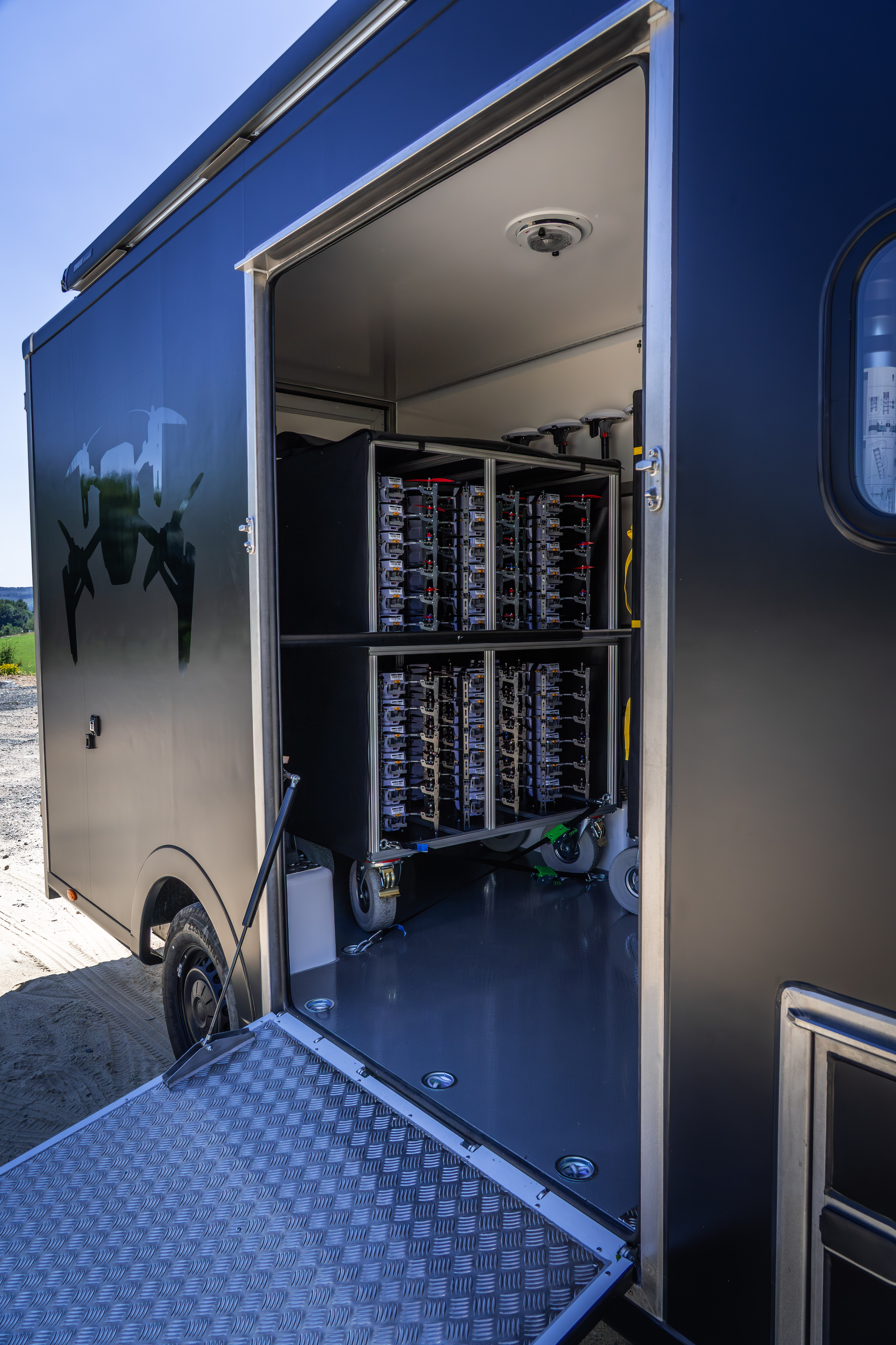 At first glance, this dark, suspiciously inconspicuous vehicle has all the makings of a gadget from a classic spy movie. But instead of surveillance tech, it contains the next smart step in our rental offering – one that makes drone shows easier than ever. Introducing: the Dronemobile.