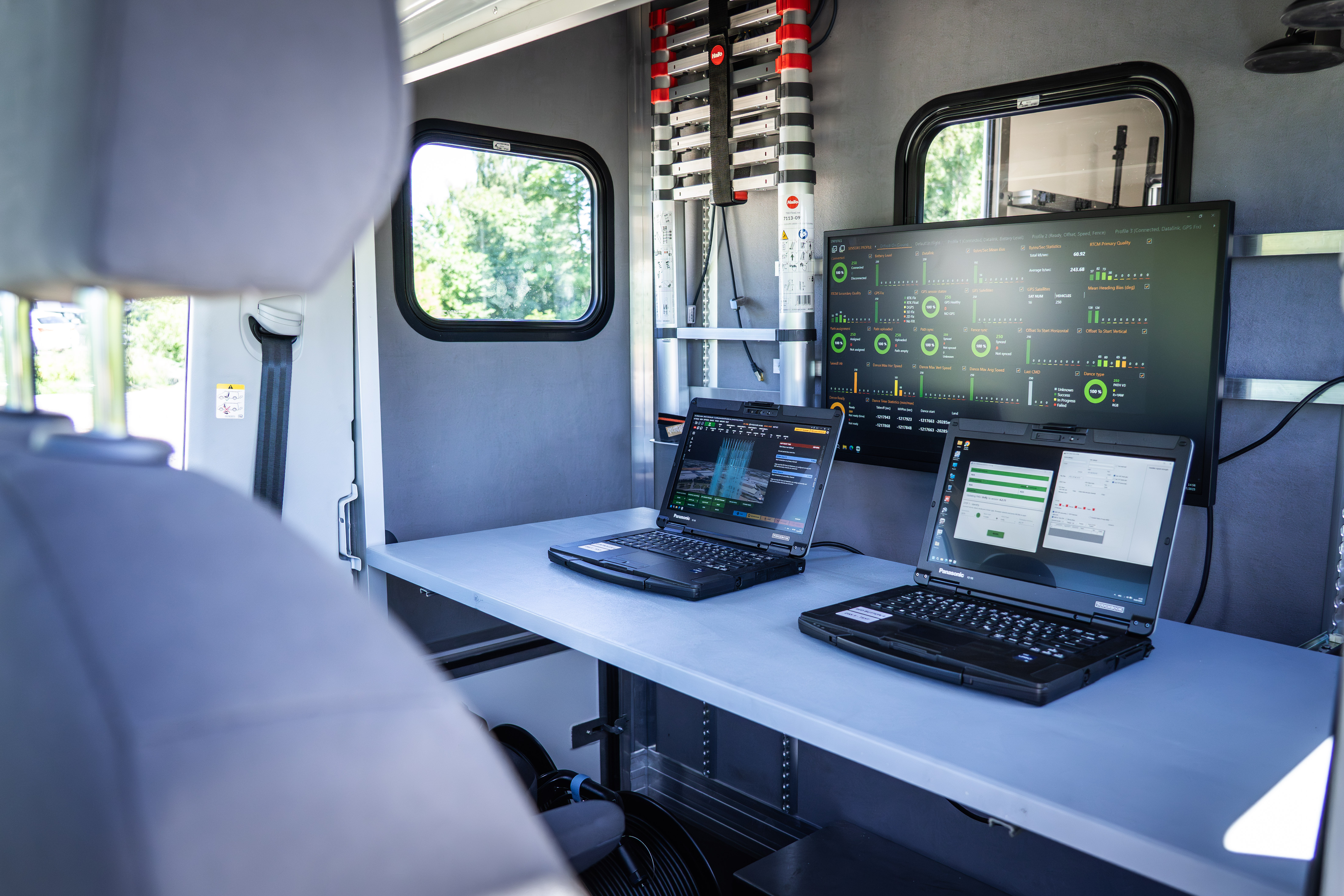 Two rugged Panasonic Toughbooks handle monitoring and control, powered by a robust battery system with racks and storage. The full control setup can be operated comfortably from inside the Dronemobile.