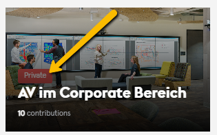 Private rooms, however, are by invitation or request. They are visible on the main rooms page, but you’ll note a “private” label above the room name. These rooms allow for defined groups to interact. They may be based on content requiring registration or simply by a request from industry groups. If you are interested in joining a private room, please make your request by emailing xchange@avixa.org.