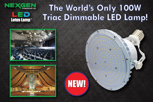 The NexGen Lotus Lamp is available in 40, 60 & 100 Watt options to replace 300, 500 & 1,000 Watt Incandescent and Halogen Lamps. The 100W Lotus Lamp is the World's Only Triac Dimmable LED lamp. The Proprietary & Patented Diecast Heat-Sink Design provides excellent Thermal Management and Heat Dissipation. The Lotus Lamp also easily fits into existing PAR Cans which makes Retrofitting easy. No need to replace traditional fixtures, simply Plug N’ Play
