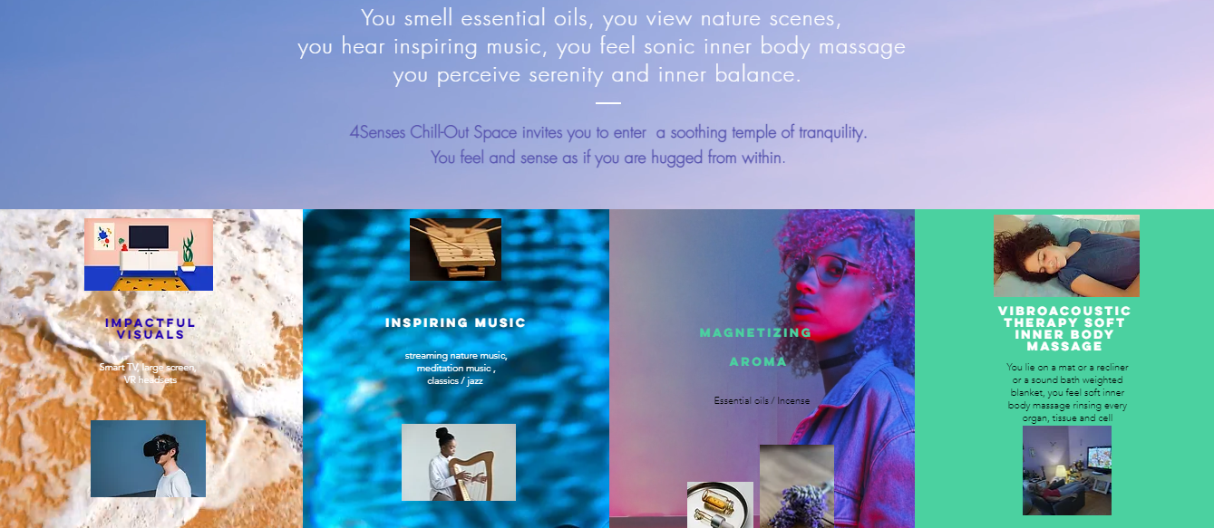 We invite Audio-Visuals experts to join us in creating 4Senses Chill-Out Spaces in hotels, airports, fitness centers, trade shows and malls.
