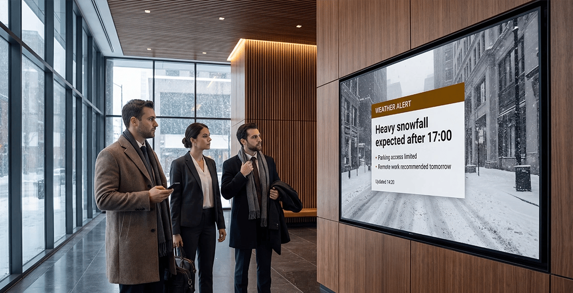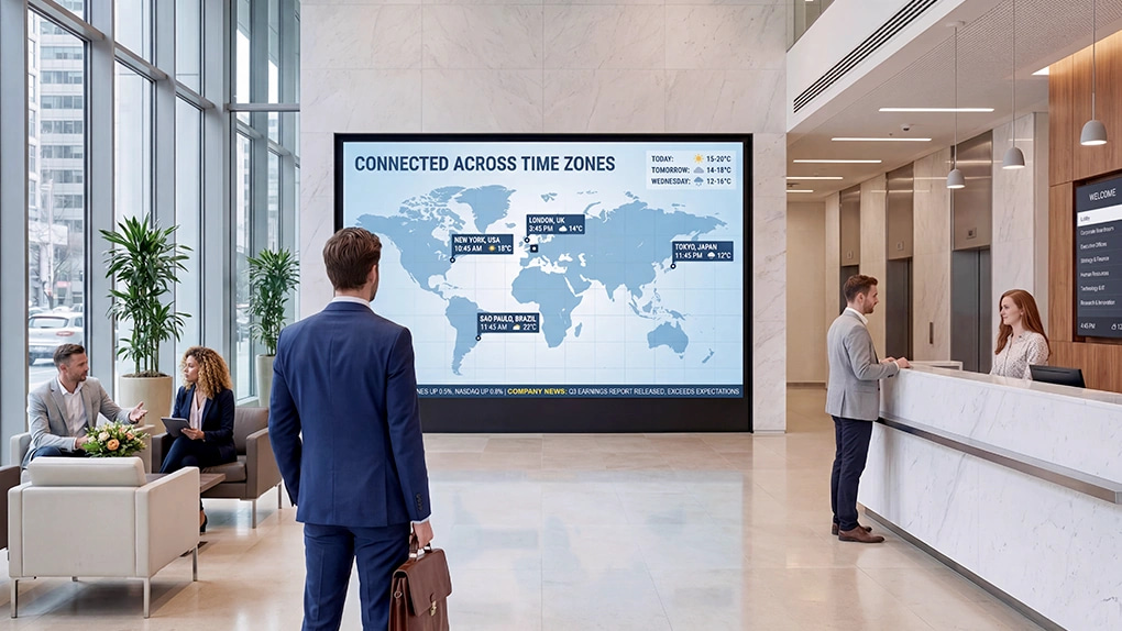 Digital signage provides a visible, always-on communication layer, ensuring the right message reaches the right audience at the right time, keeping everyone informed and engaged, whether in a single headquarters or across a network of offices in multiple countries.