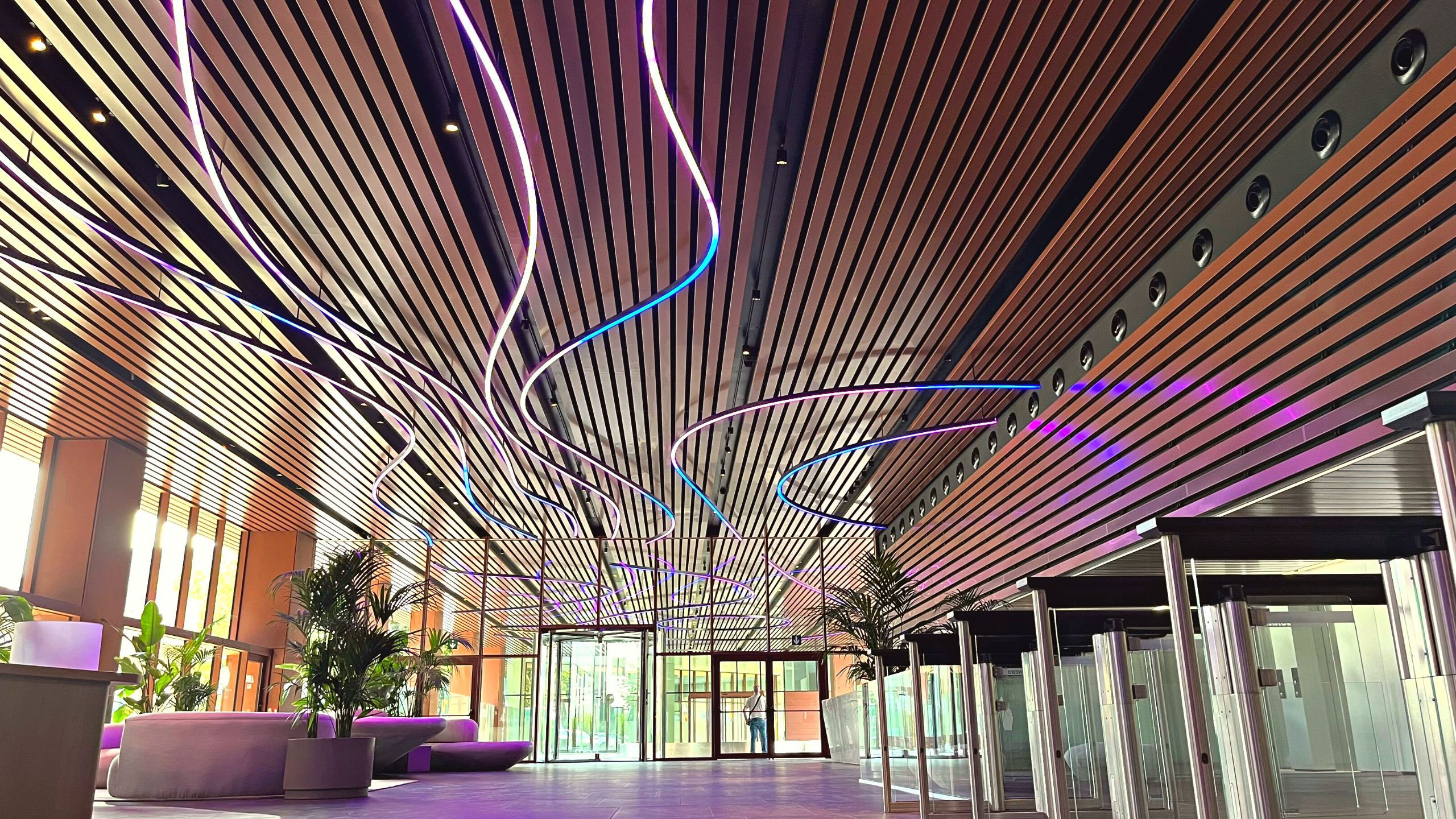 A spectacular lobby: 350 meters of digital lighting make the new Álaba 111 building a landmark in Barcelona.
