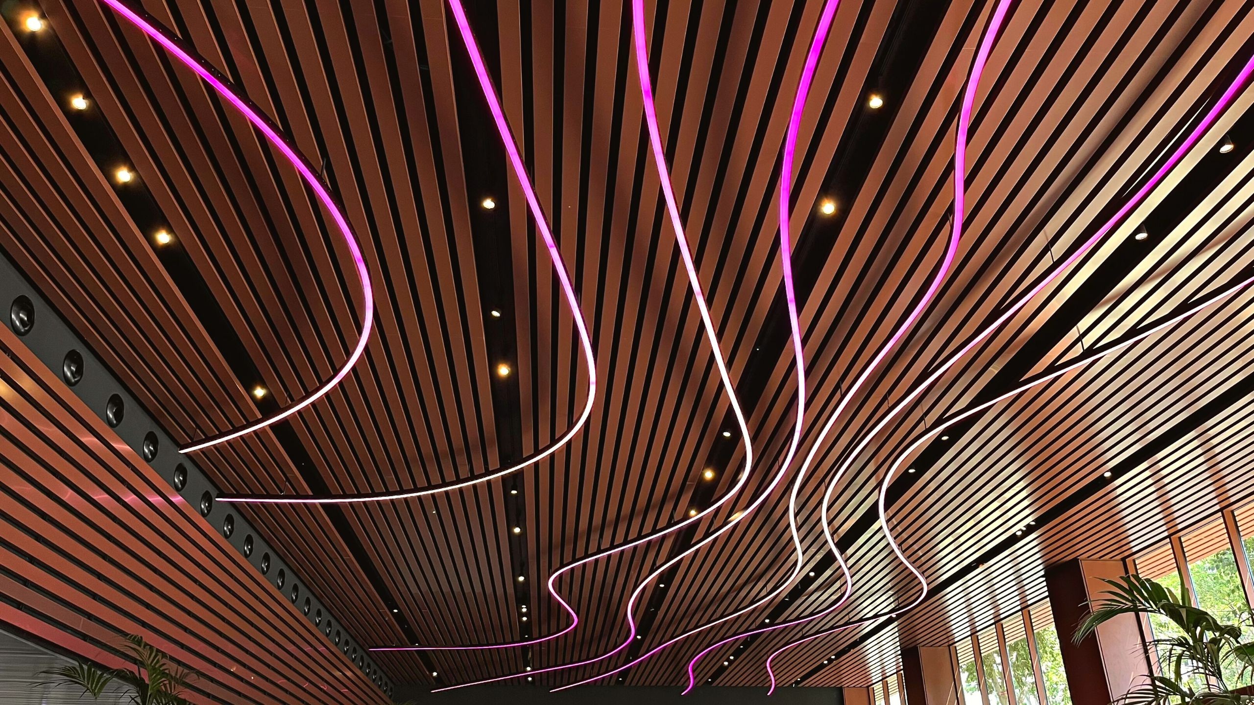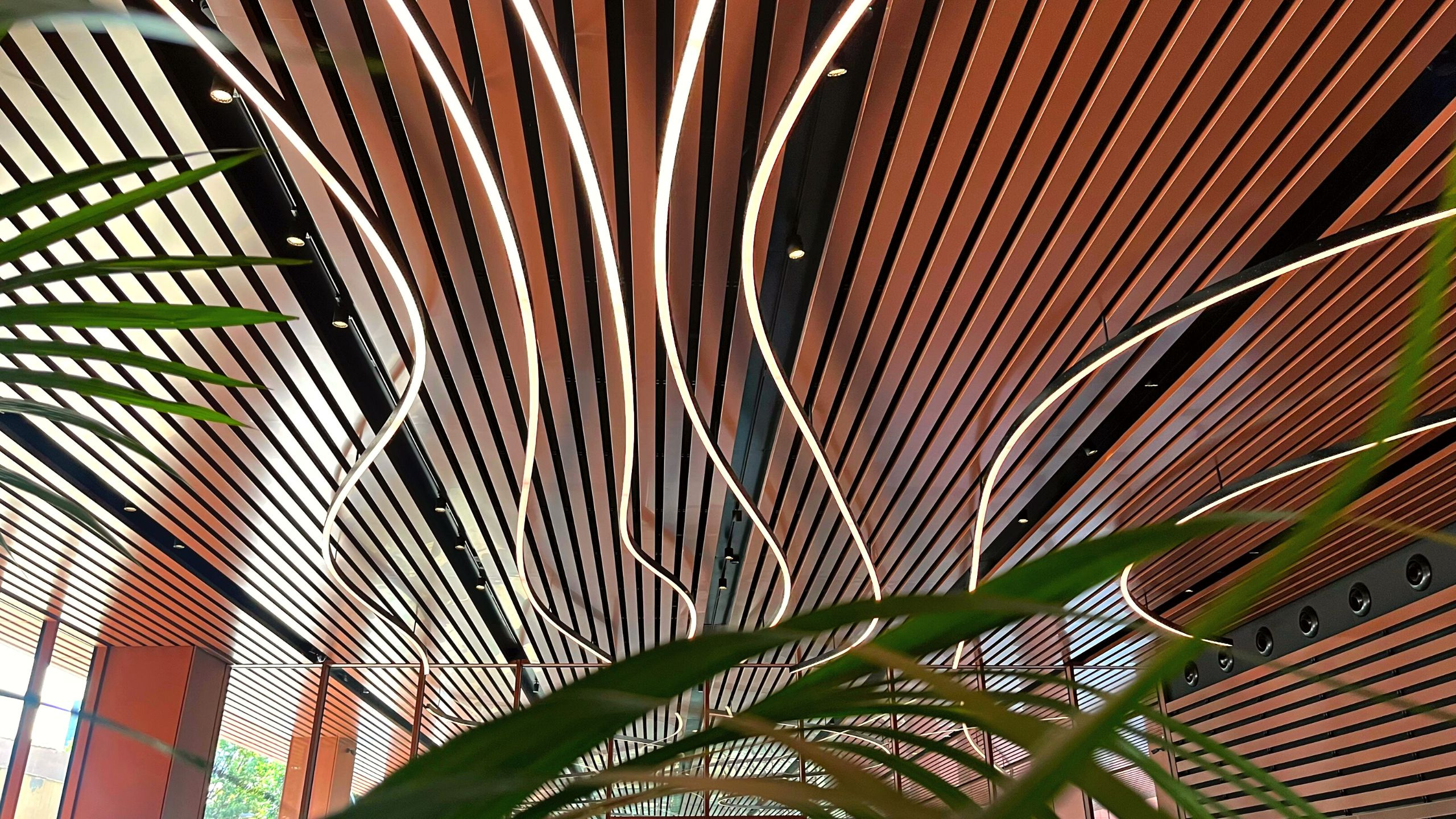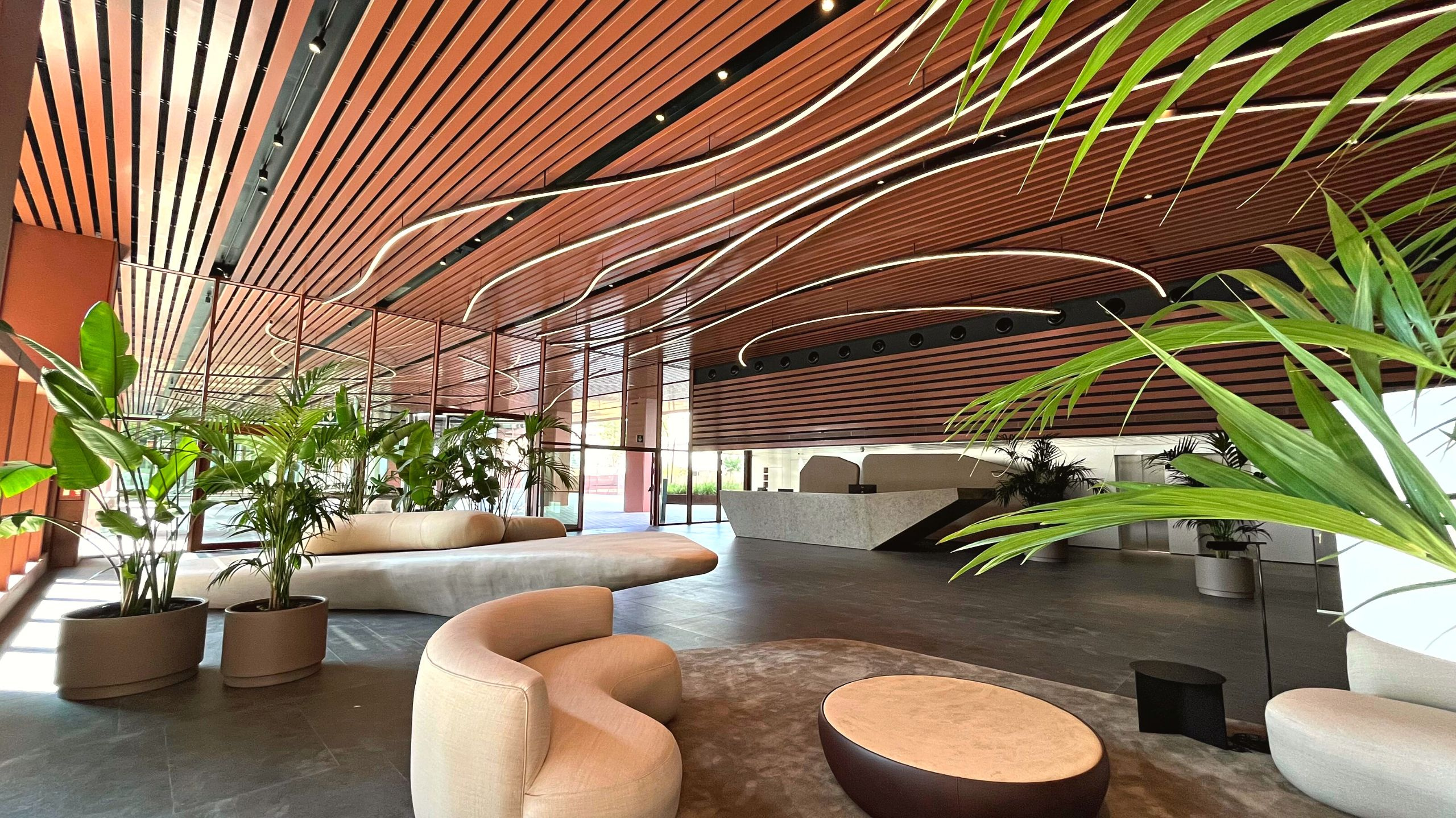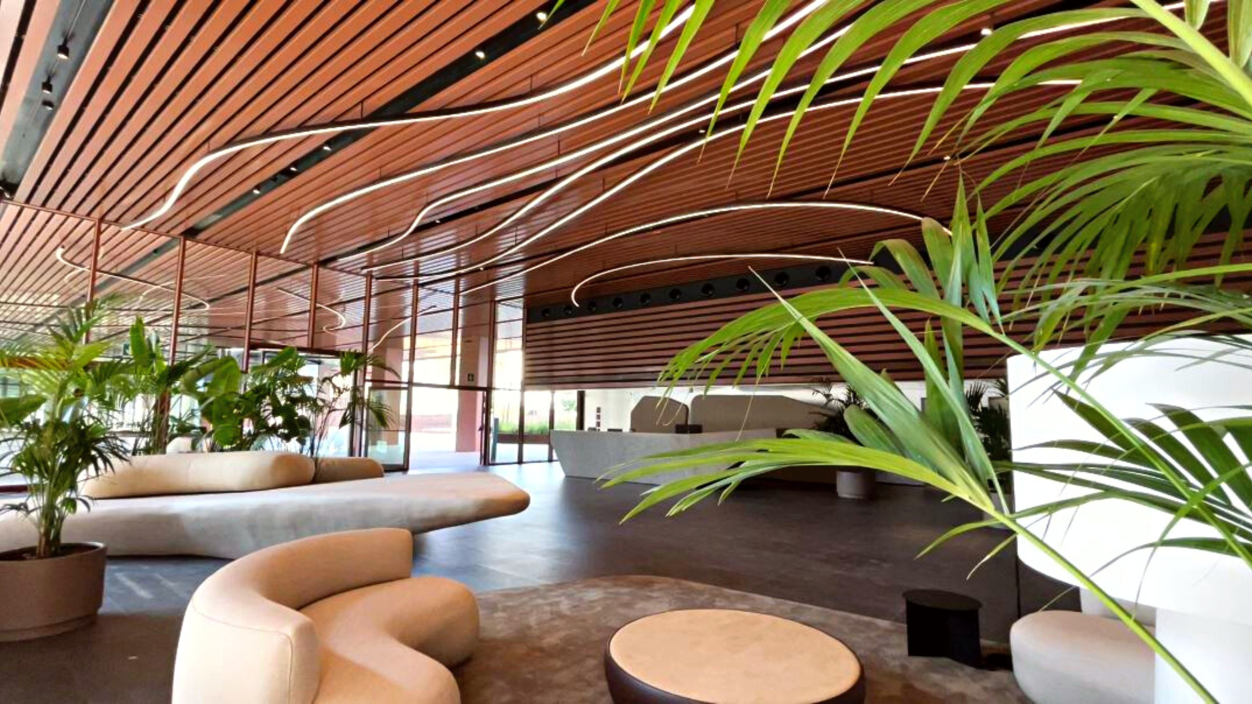In this luminous and digital space, the volume of the lobby and the furniture required a ceiling element that would break away from linearity and add value to the integration of the interior and exterior spaces. To achieve this, Lumalia Studio has designed a revolutionary lighting solution called NURBS. This innovative semi-supporting linear solution can be constructed in any type of layout or curve, allowing for efficient and versatile construction.