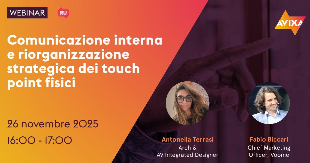 🔊 Webinar AVIXA in #italiano in arrivo! Il 26 novembre alle 16:00 Antonella Terrasi, Arch & AV Integrated Designer, e Fabio Biccari, Chief Marketing Officer di Voome - Digital Signage Cloud Platform, presenteranno strategie di coinvolgimento fisico attraverso l’uso del digital signage, approfondendo metodologie e casi studio concreti.