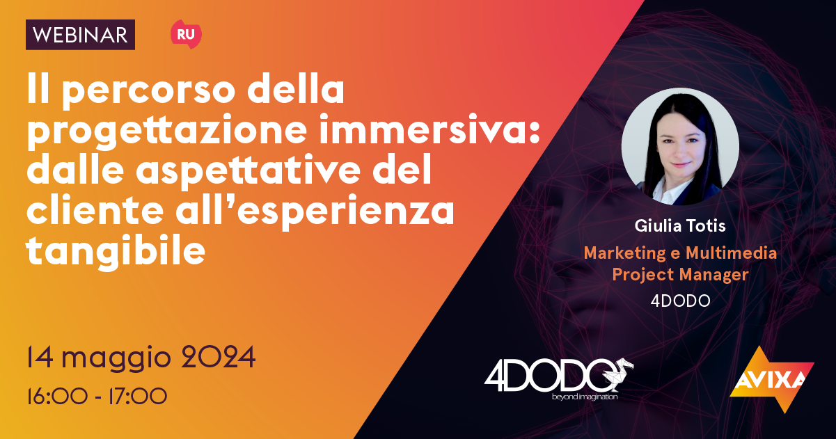 ✍️ Il 14 maggio alle 16:00 non perdete il primo #webinar AVIXA in italiano in collaborazione con 4DODO - Beyond Imagination. Giulia Totis, Marketing e Multimedia Project Manager di 4DODO, presenterà i molteplici aspetti che caratterizzano il processo di produzione di un'esperienza immersiva dall'ideazione alla realizzazione.