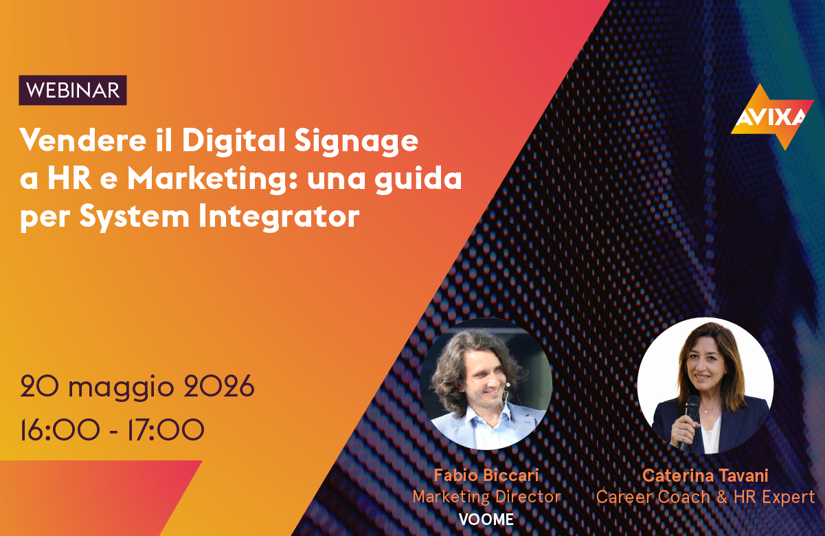 🔊 Non perdetevi il prossimo webinar AVIXA in italiano! Il 20 maggio alle 16:00 Caterina Tavani, Career Coach & HR Expert, e @Fabio Biccari, Marketing Director di @Voome S.r.l., presenteranno come le soluzioni di digital signage possano porsi al servizio delle esigenze del mondo #HR e #Marketing, unendo comunicazione interna efficace e uso strategico delle tecnologie.