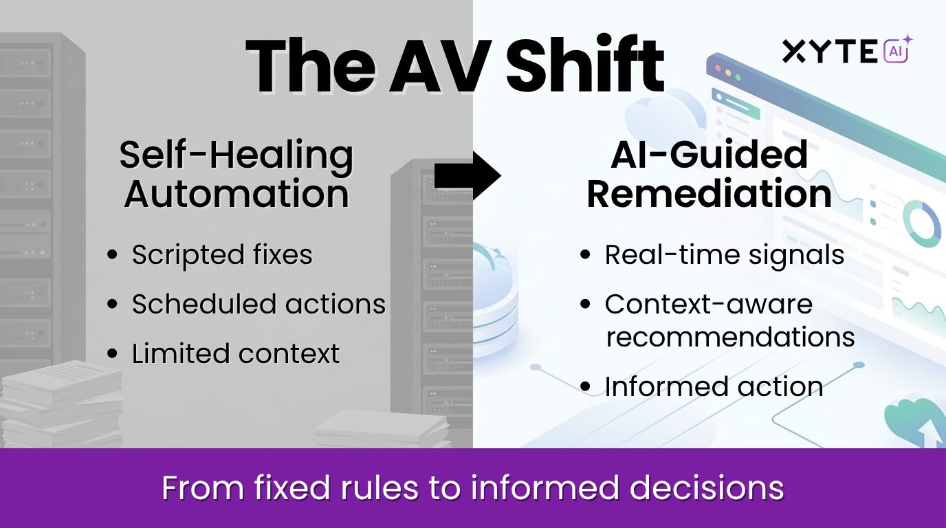 Self-healing solved a real problem. But it only handles known issues. Modern AV environments are dynamic. They require systems that can interpret signals, explain what changed, and guide the right response in real time.