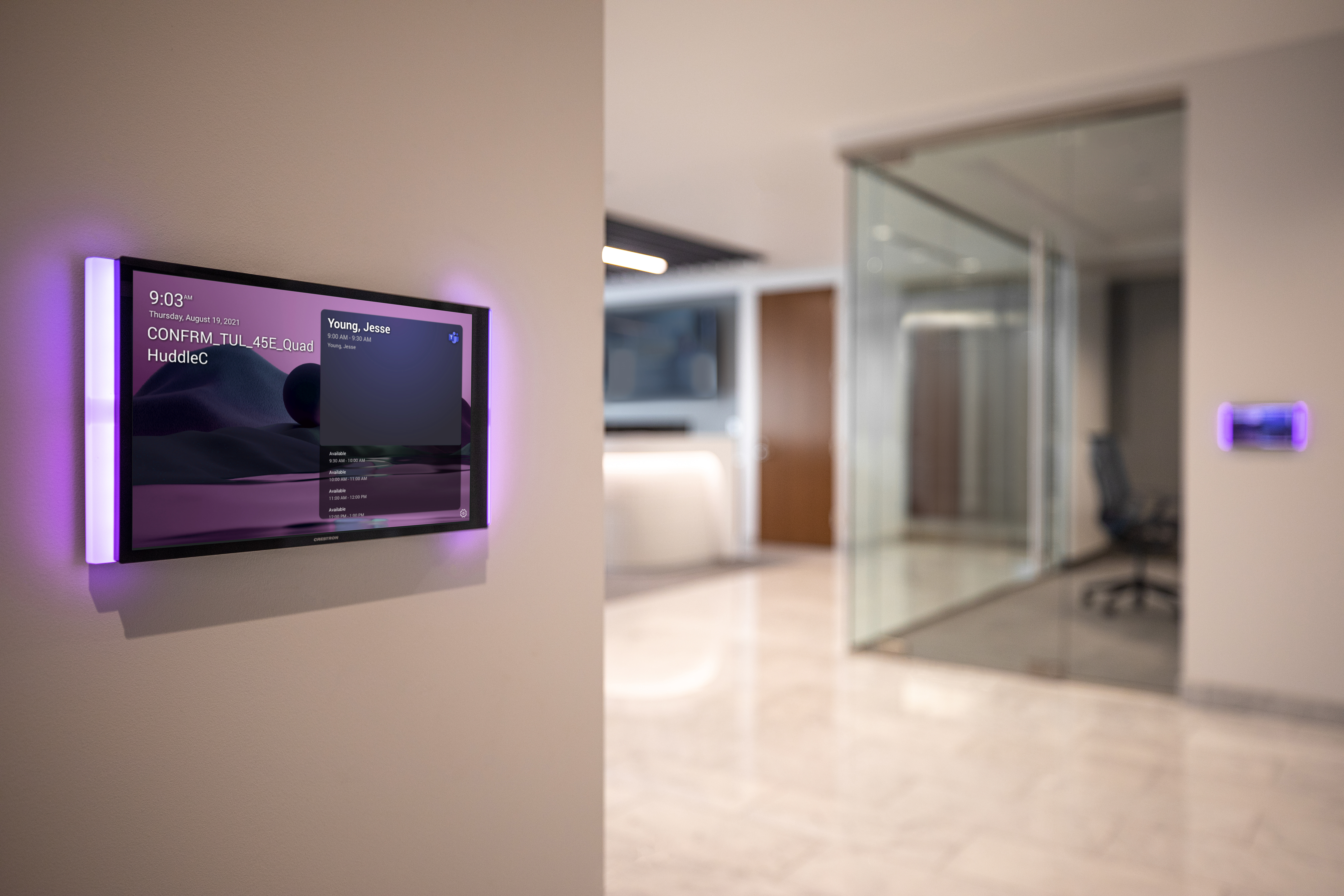 Crestron and Microsoft Teams Panels have created a cohesive meeting room experience bringing room booking and the in-room collaboration software together. The Crestron Scheduling Panels integrated with Microsoft Teams allow employees to see which rooms are occupied at-a-glance with purple illumination demonstrating when a space is in use. Employees can easily locate the green lightbars to identify which rooms are available and book an open space with a simple touch on the panel. In addition, it integrates with occupancy sensors communicating to the panel to release the room when employees don’t show up for their scheduled meeting.