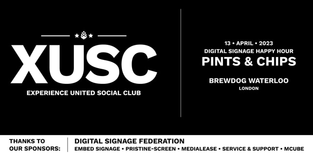 We are hosting a XUSC Digital Signage Happy Hour on April 13th in London from 17:30 to 20H. Join us at Brewdog Waterloo for a lively evening of pints, chips, and conversation with fellow Digital Signage friends and colleagues!